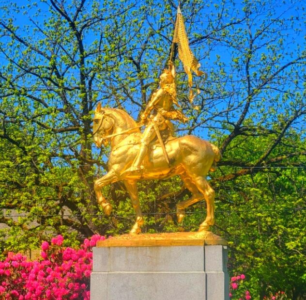 Portland Joanie shared some time with New Orleans Jehanne while stored in France, then arriving in Oregon in 1924.i She was a private donation to the city and inaugurated on Memorial day dedicated in honor of the Doughboys of World War I who considered St. Joan their patron saint. The soldiers allegedly sang “Joan of Arc, They are Calling You”